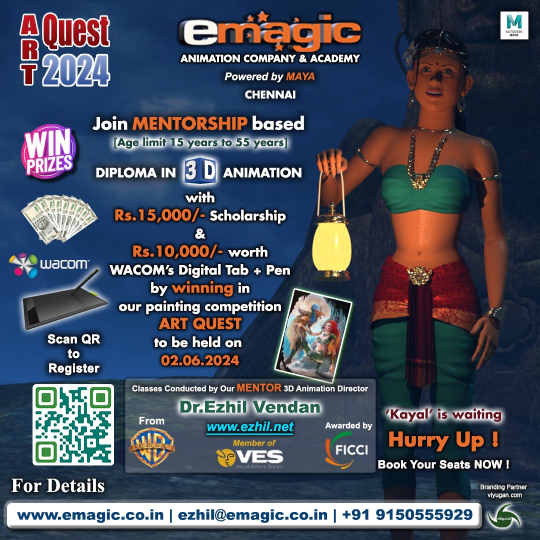Prizes: Handsome SCHOLARSHIPS ranging from INR 7500-15000 are provided for the first 3 winners of Art Quest, for Emagic’s diploma course admission!